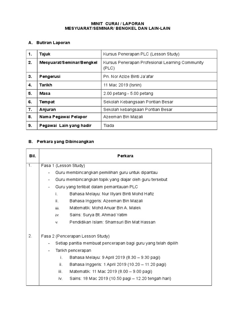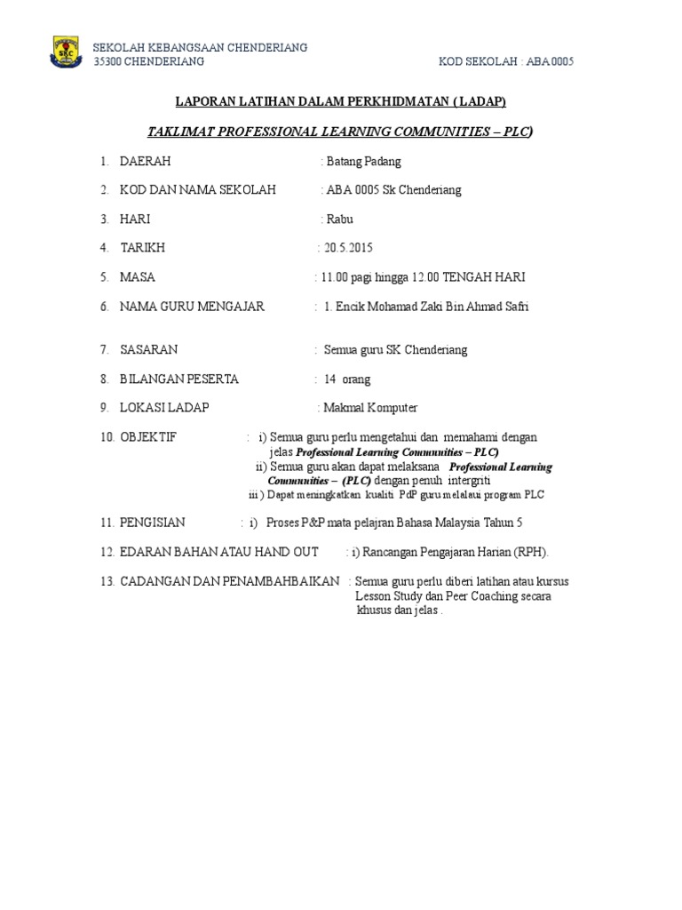Contoh laporan plc 1. PLC merujuk kepada para pendidik yang komited dan bekerja secara kolaboratif serta berterusan dalam membuat inkuiri atau kajian tindakan untuk mencapai prestasi yang lebih baik untuk murid-murid. Toolkit LS 1 RANCANGAN PENGAJARAN HARIAN RPH Sekolah SJKC Lok Yu 2 Tarikh 20 Mei 2015 TingkatanKelas Tahun 5 Waktu 830 pagi -900 pagi Saiz kelas 3 orang Tempoh Minit 30 minit Mata Pelajaran Bahasa Malaysia Bidang Pembelajaran Morfologi Topik Kayuhan Amal Tema Tema 5- Hormati Komuniti Konsep Utama Tajuk Kayuhan Amal Rasional.