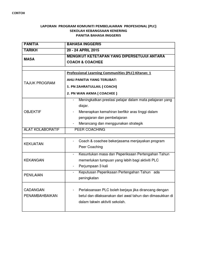 LAPORAN PLC - LESSON STUDY PANITIA BAHASA MELAYU LAPORAN BERGAMBAR DAN DOKUMENTASI. Kami hanya tulis secara ringkas sahaja tidak lah terlalu terperinci. Bil Nama Tandatangan Catatan 1 Yii Nguok Ching Pakar Rujuk 2 Cheng Chu Hui ff LAPORAN REFLEKSI PEER COACHING SEKOLAH.